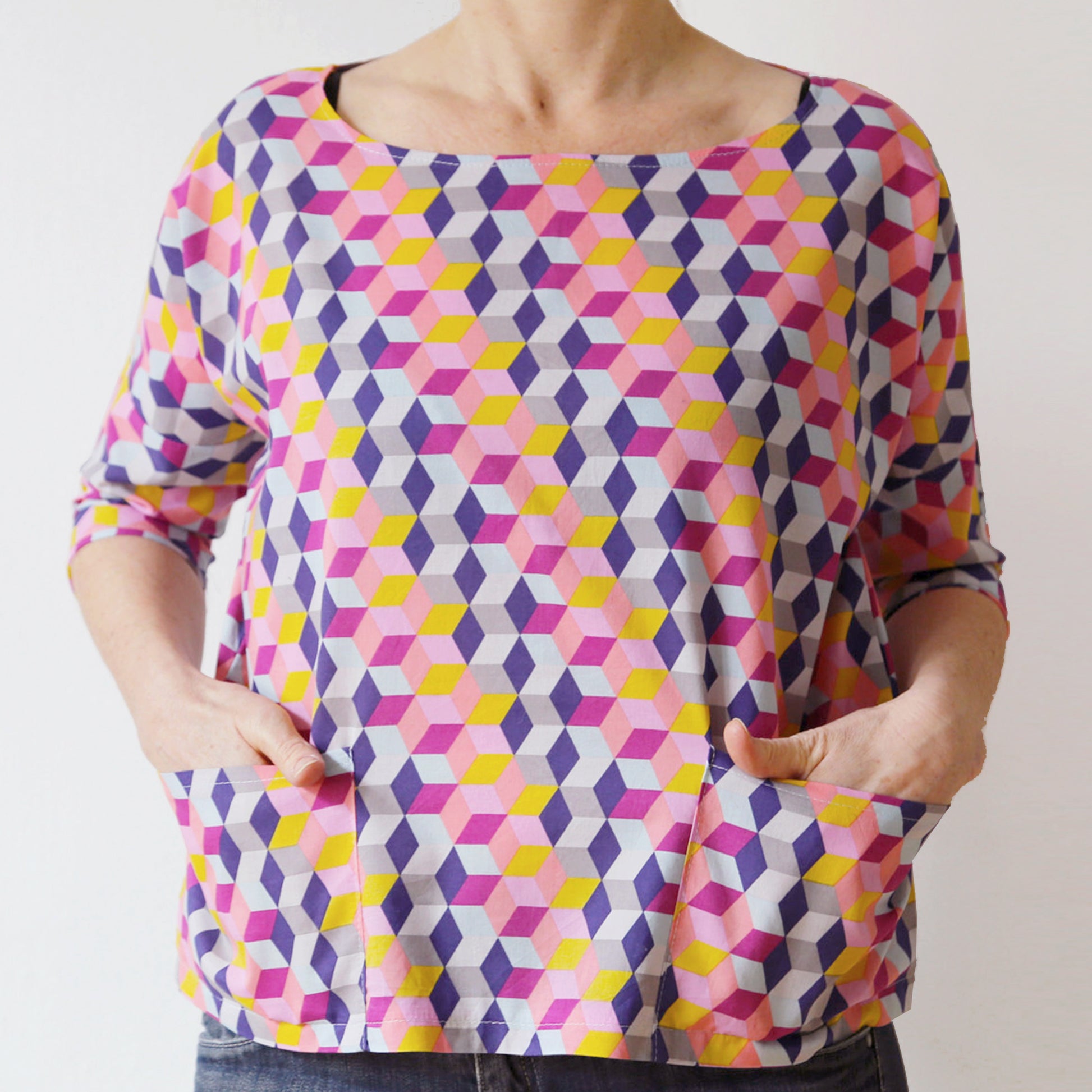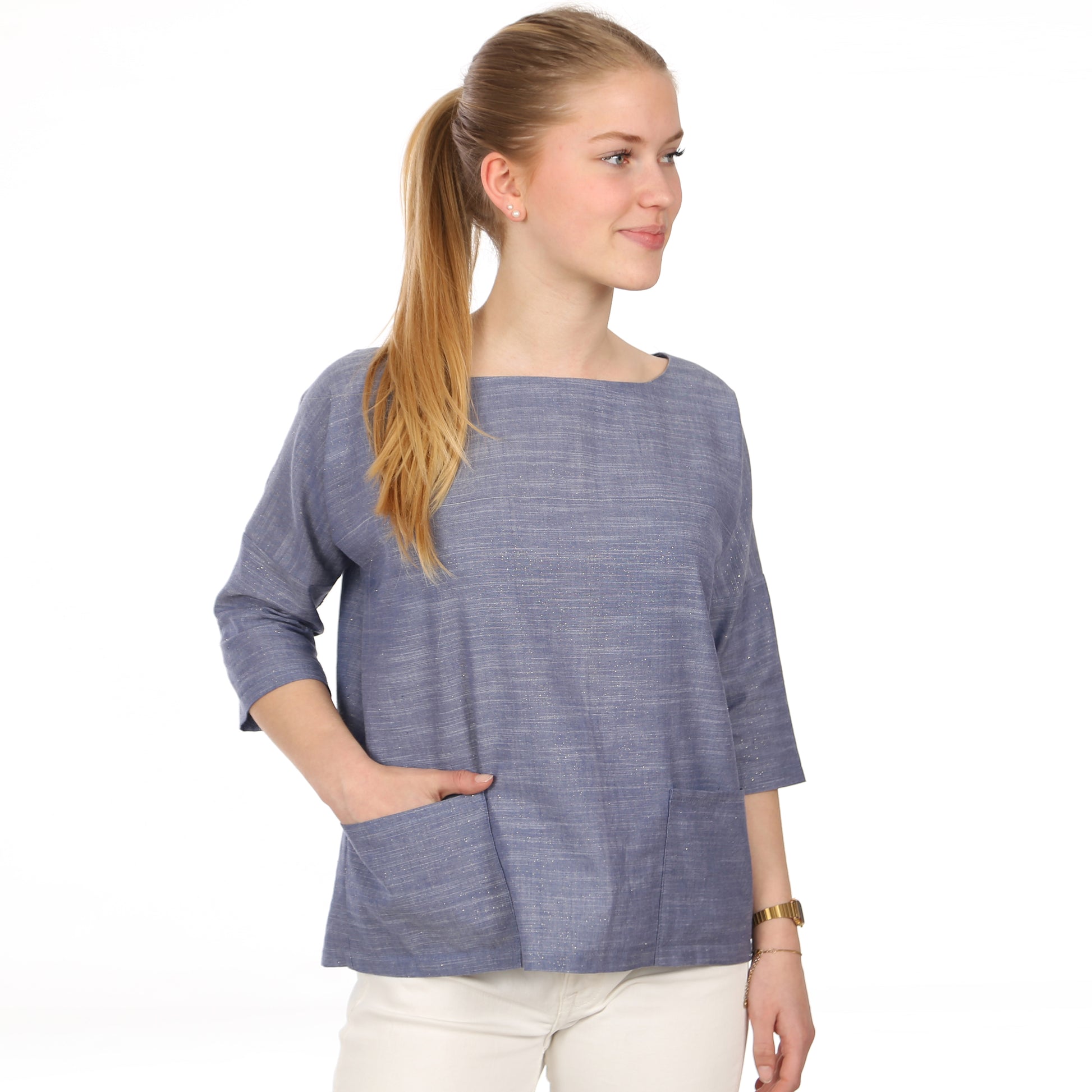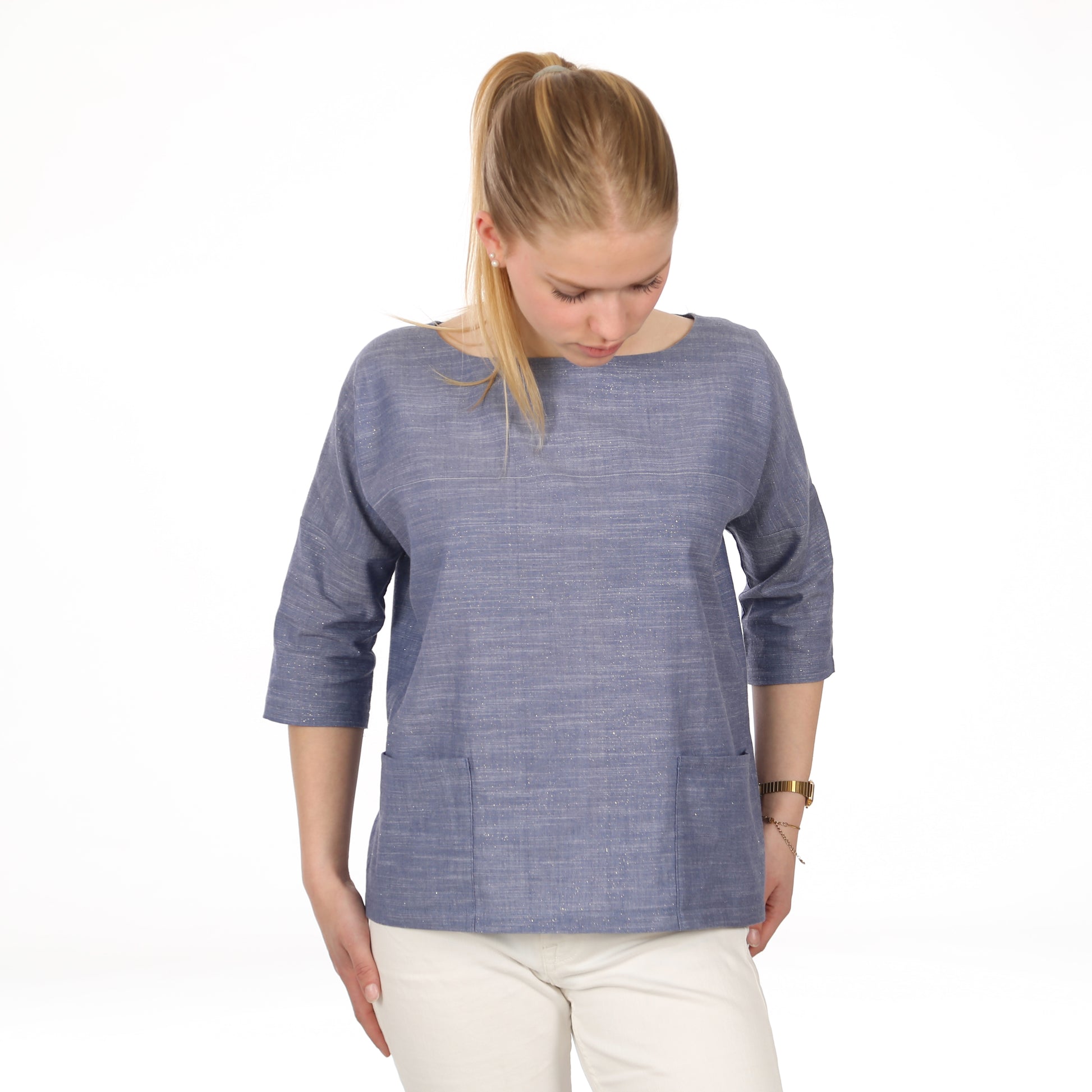 FRAU AIKO ist ein Schnitt für alle, die es schlicht und modern mögen. Die Bluse sitzt locker, hat überschnittene Schultern und einen geraden, kurzen Saum. Ein besonderer Hingucker sind die großen aufgesetzten Taschen, die in Saum und Seitennaht eingearbeitet werden. Mit den 3/4-langen Ärmeln wird die Bluse ein Lieblingsteil vom Frühling bis in den Herbst! Ruck Zuck genäht mit der farbig bebilderten, ausführlichen Nähanleitung.