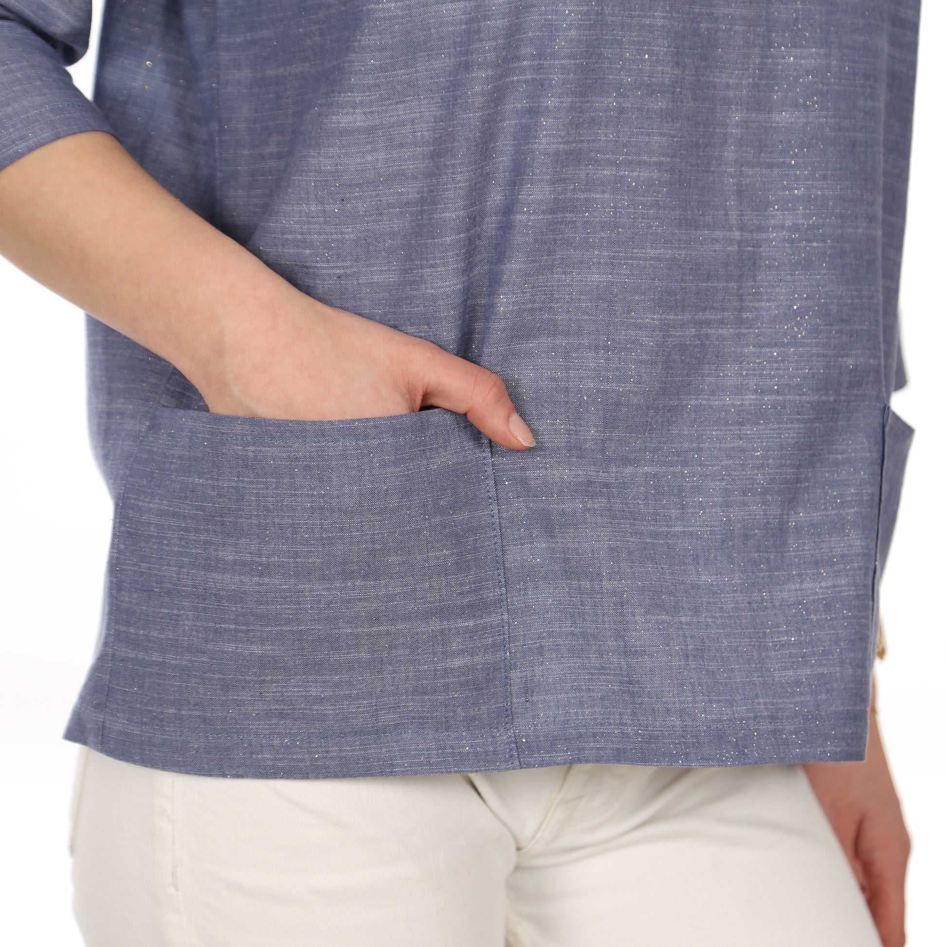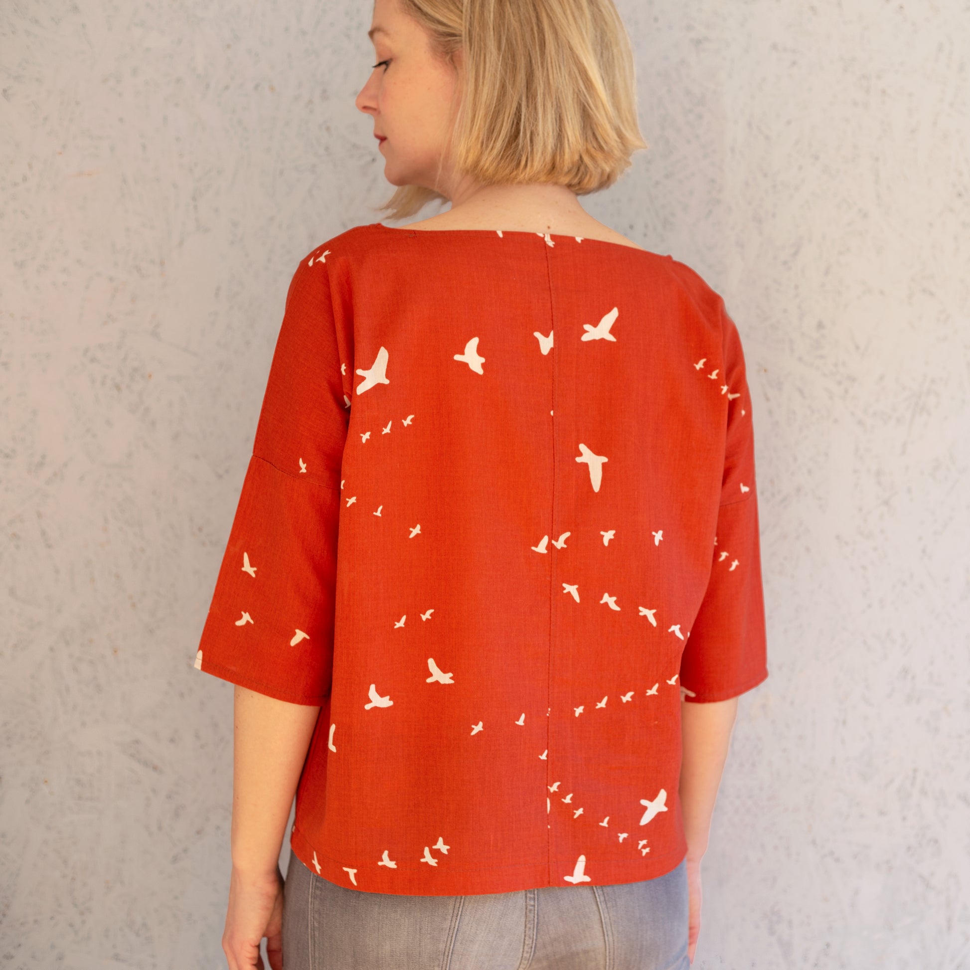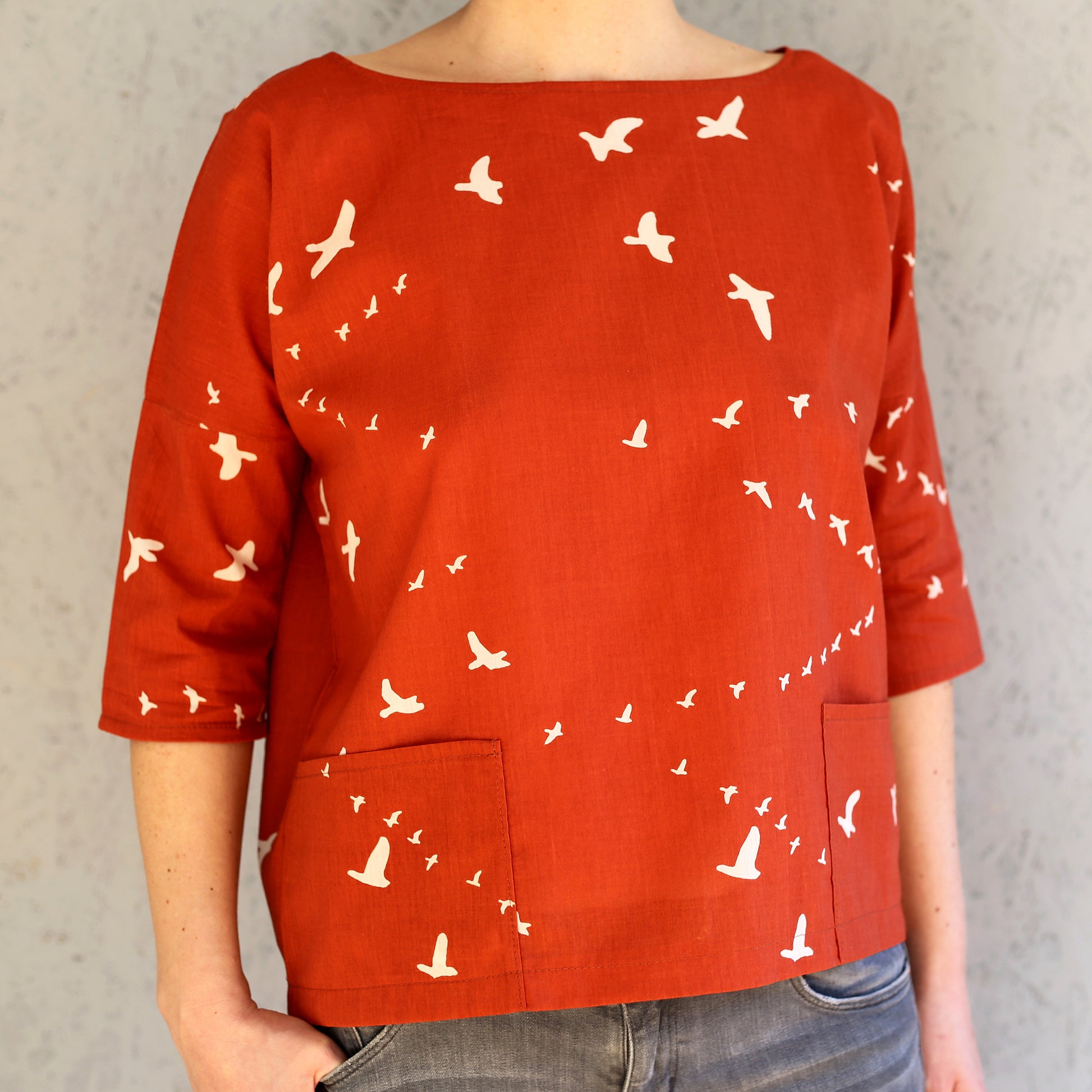 FRAU AIKO ist ein Schnitt für alle, die es schlicht und modern mögen. Die Bluse sitzt locker, hat überschnittene Schultern und einen geraden, kurzen Saum. Ein besonderer Hingucker sind die großen aufgesetzten Taschen, die in Saum und Seitennaht eingearbeitet werden. Mit den 3/4-langen Ärmeln wird die Bluse ein Lieblingsteil vom Frühling bis in den Herbst! Ruck Zuck genäht mit der farbig bebilderten, ausführlichen Nähanleitung.