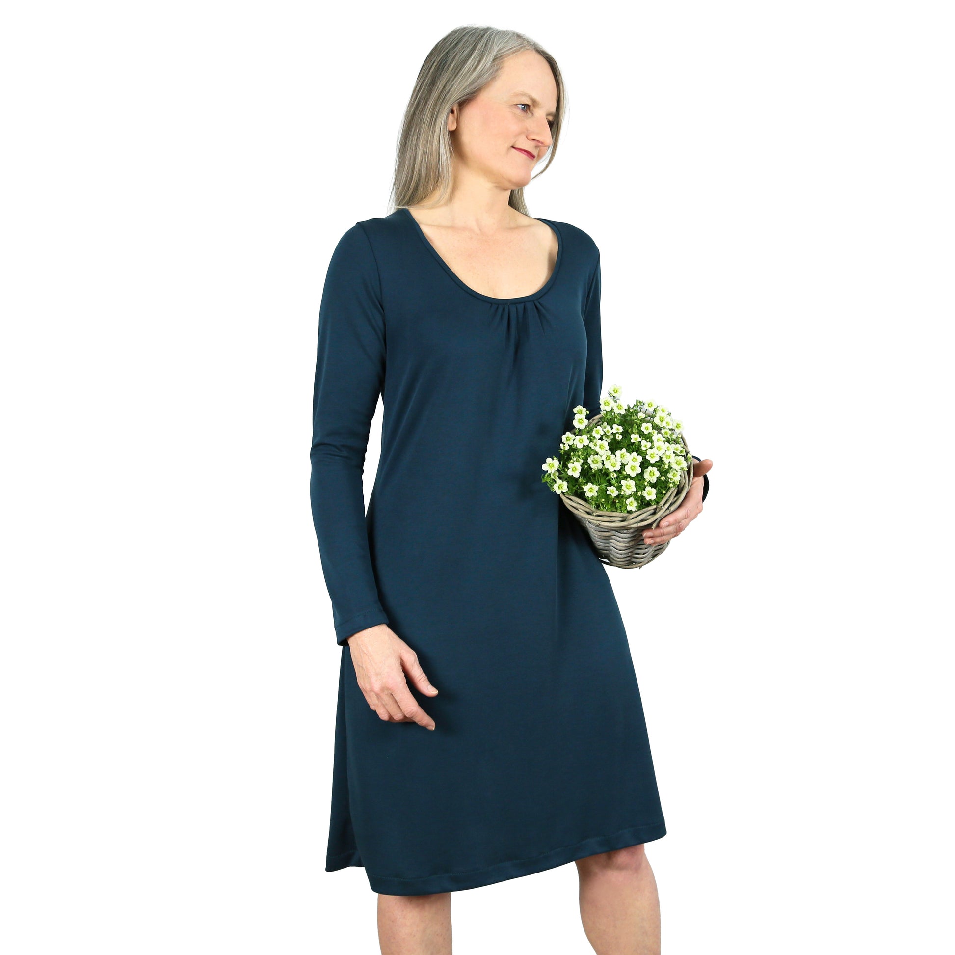 Mit FRAU VLIELAND hast Du die Qual der Wahl. Das knielange, leicht ausgestellte Rundhalskleid kann wahlweise mit oder ohne Kräusel im Ausschnitt genäht werden. So fällt es entweder körpernah oder aber etwas weiter aus. Zur Wahl stehen außerdem drei unterschiedliche Ärmellängen, ein kleiner Puffärmel und zwei mögliche Ausschnitttiefen. So wird das Kleid sommer- und wintertauglich. Alle Schnittteile lassen sich miteinander kombinieren, so kann sich jeder sein eigenes Modell zusammenstellen – vom sportlichen Hosenkleidchen bis hin zum kleinen Schwarzen.