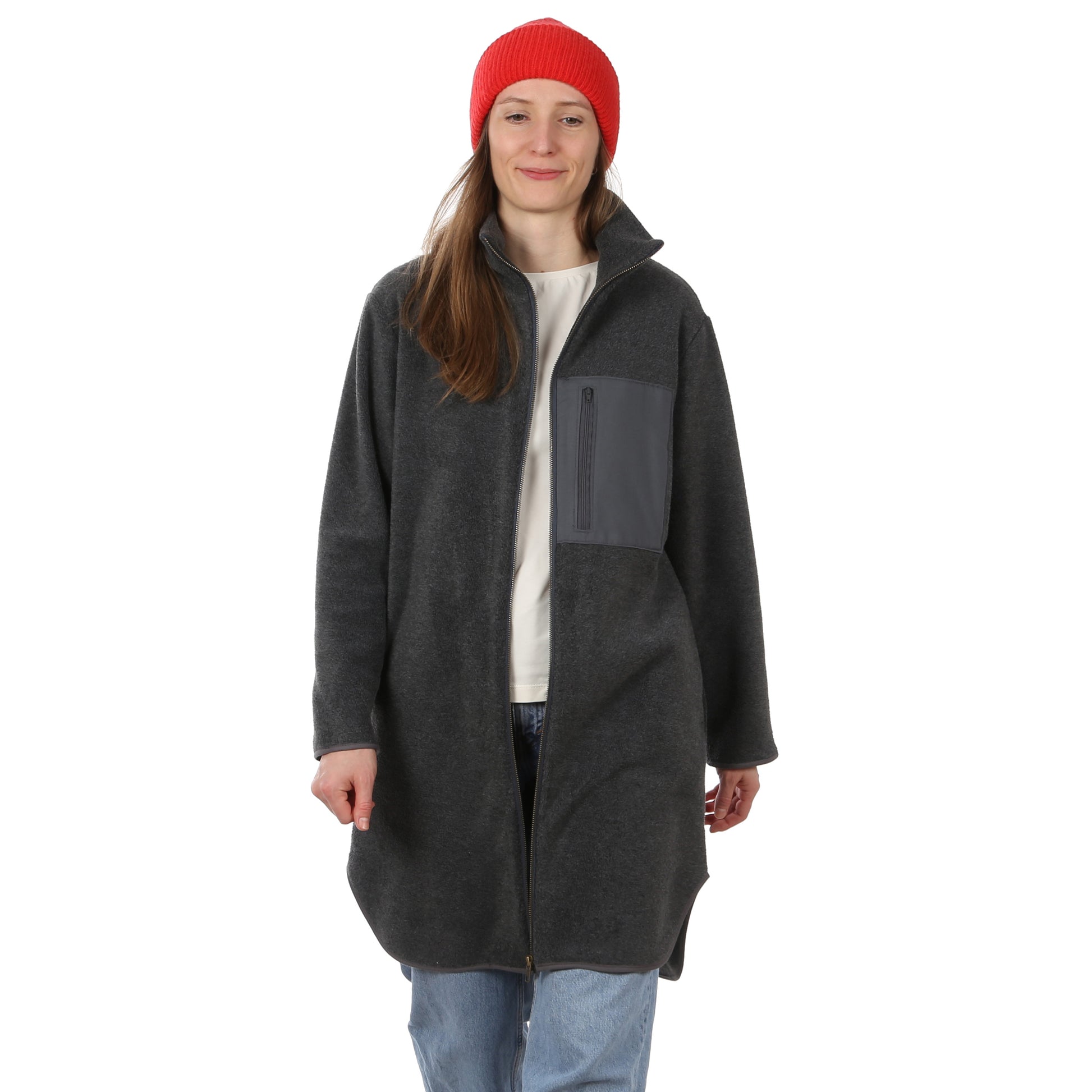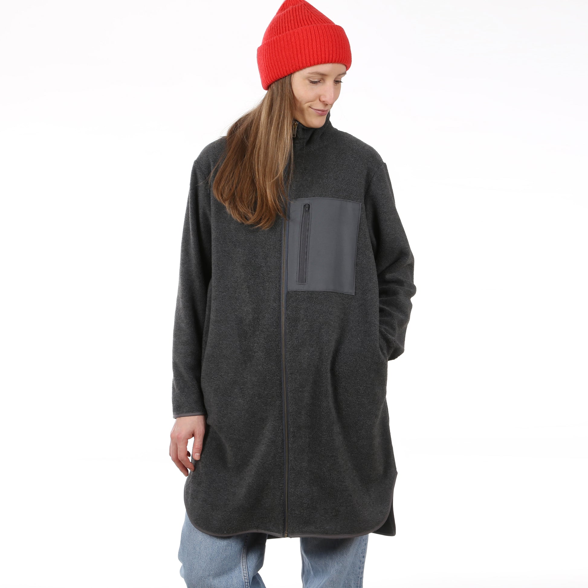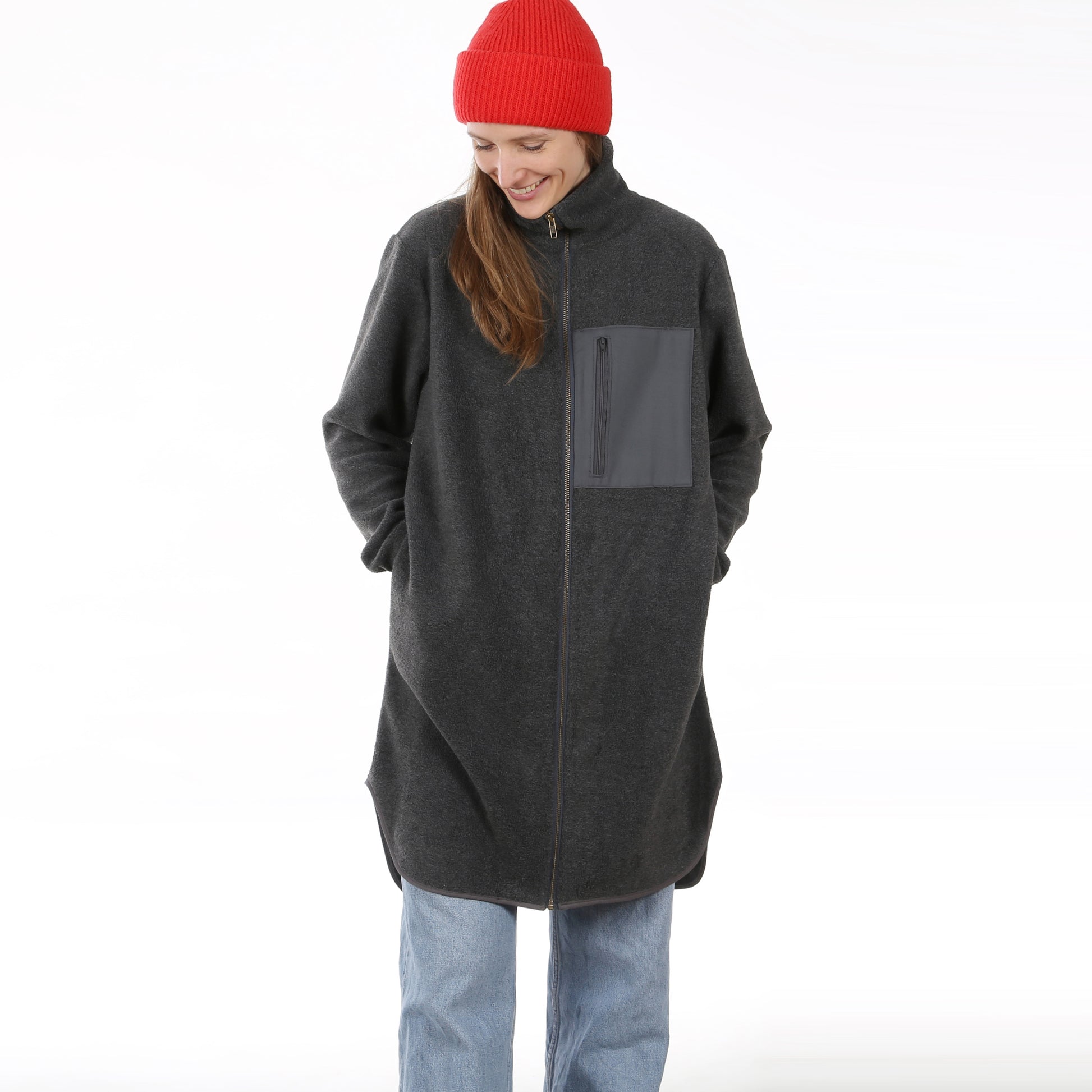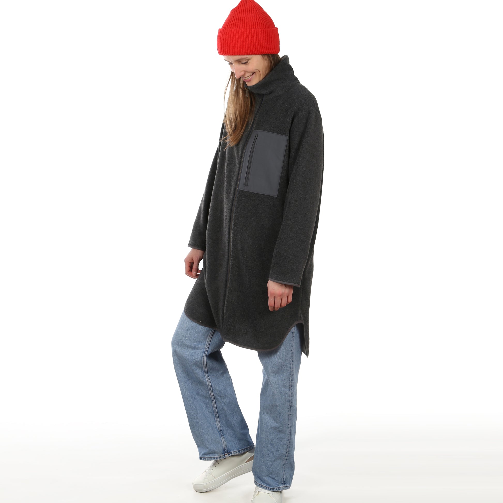 Mit FRAU MOA nähst du dir einen knielangen Fleecemantel, der Funktionalität und Style perfekt verbindet. Der geschwungene, nach hinten verlängerte Saum sorgt für eine moderne Silhouette. Besonders praktisch – und gleichzeitig ein schönes Design-Statement – ist die große Brusttasche mit Reißverschluss. Du kannst sie farblich absetzen und deinem Mantel so eine ganz persönliche Note verleihen. Zusätzlich bieten die Seiteneingriffstaschen Platz für kalte Hände. Saum und Ärmelsaum sind mit Schrägband eingefasst und geben dem Mantel einen hochwertigen, sauberen Abschluss.