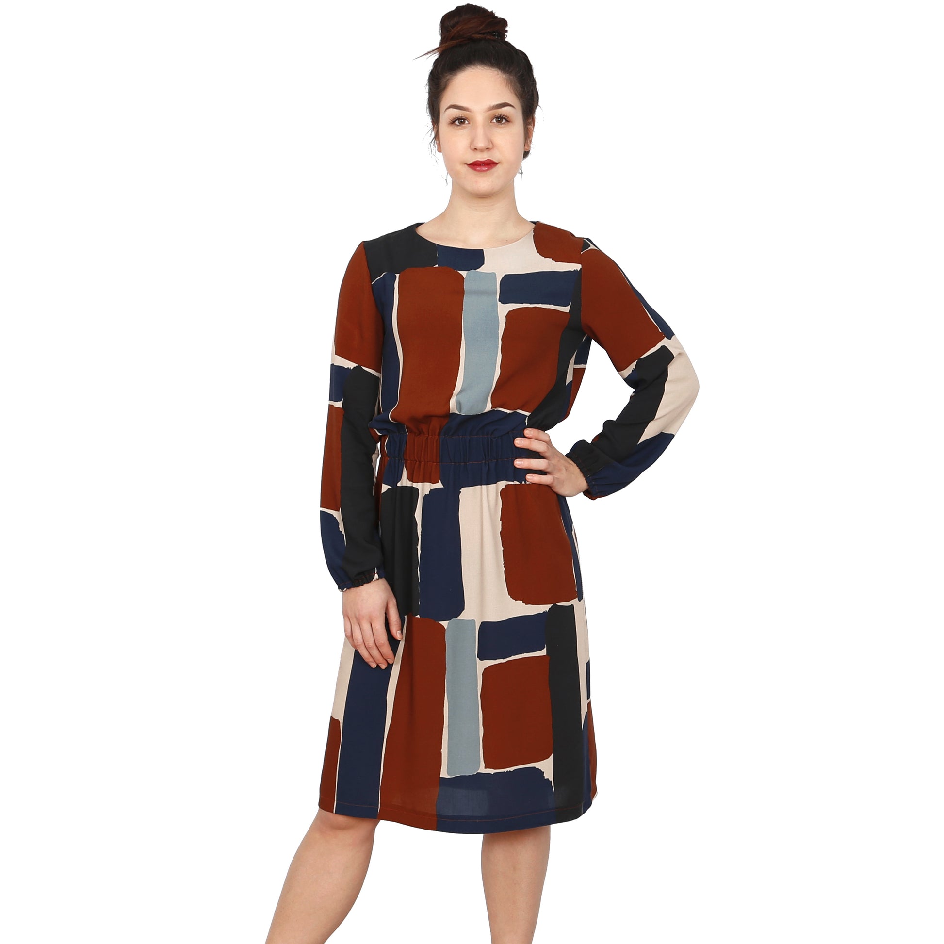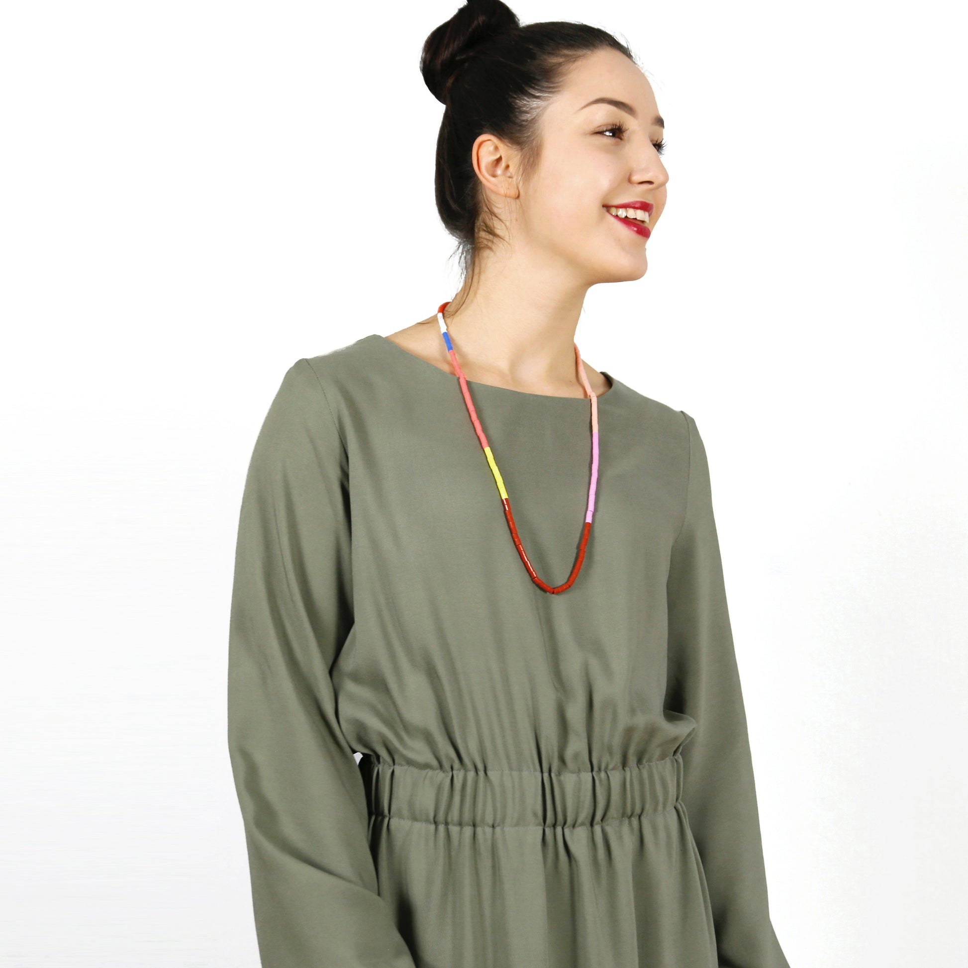 FRAU SANJA ist ein elegantes Kleid für fließende Stoffe. Der lockere Schnitt wird in der Taille mit einem innenliegenden breiten Gummi gerafft. Der lange, gerade Ärmel wird ebenfalls mit einem schmalen Gummi zusammengezogen. Der runde Halsausschnitt wird mit Beleg gearbeitet und rundet den feinen Look ab.