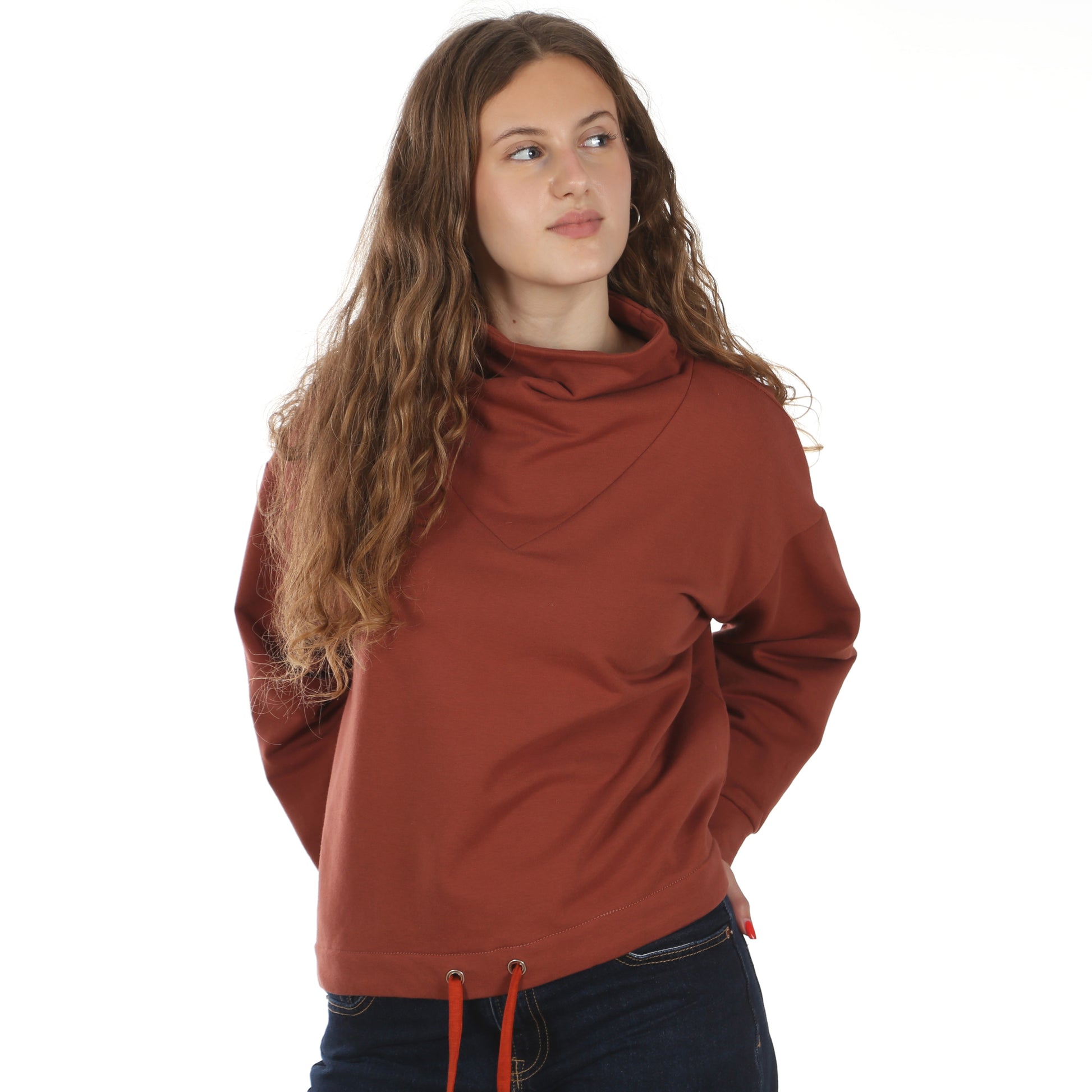 FRAU VERA ist ein ganz besonderer Pullover. Er hat einen kurzen und legeren Shape. Die Schultern sind überschnitten und die Ärmel werden mit Bündchen gearbeitet. Das Highlight ist der weich fallende Kragen, der in einen großen V-Ausschnitt eingesetzt wird. Der Saum kann in zwei Varianten gearbeitet werden. Er wird durch einen Gummizug oder ein Bändchen leicht zusammengezogen.