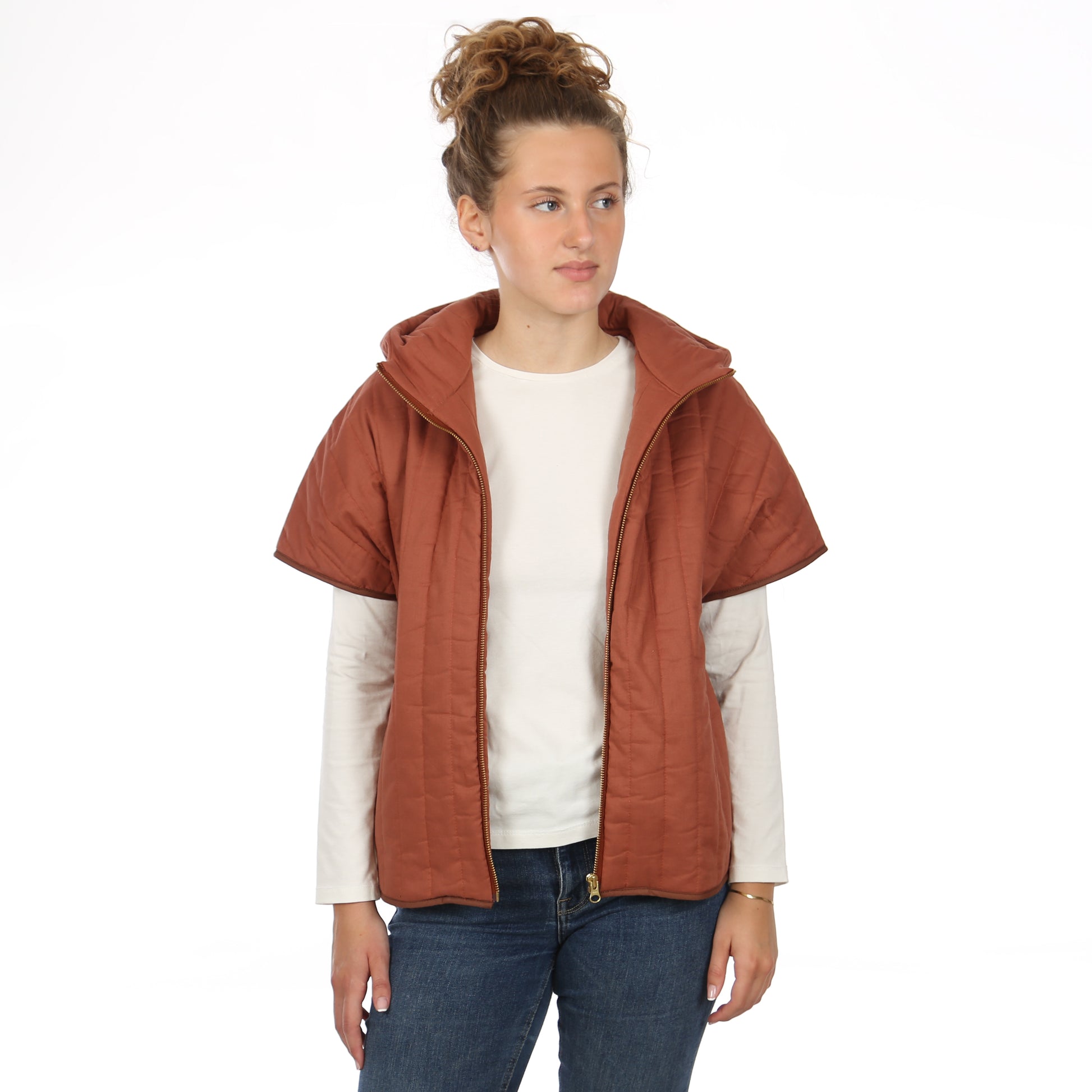 Die Steppweste FRAU KYRA vereint gemütlichen Komfort mit modernem Design. Mit ihren kurzen, angeschnittenen Ärmeln hält sie dich wunderbar warm, ohne einzuengen. Die doppellagige Kapuze schützt zuverlässig vor Wind und Kälte, während der praktische Reißverschluss für bequemes An- und Ausziehen sorgt. Innen ist die Weste ungefüttert und wird mit Beleg verarbeitet – so bleibt sie leicht, anschmiegsam und perfekt für den Übergang. Alle Kanten werden, für einen lässigen Look mit Schrägband eingefasst. Ob sportlich zur Jeans oder über einem Kleid kombiniert: FRAU KYRA ist ein echtes Must-have für kühle Tage.